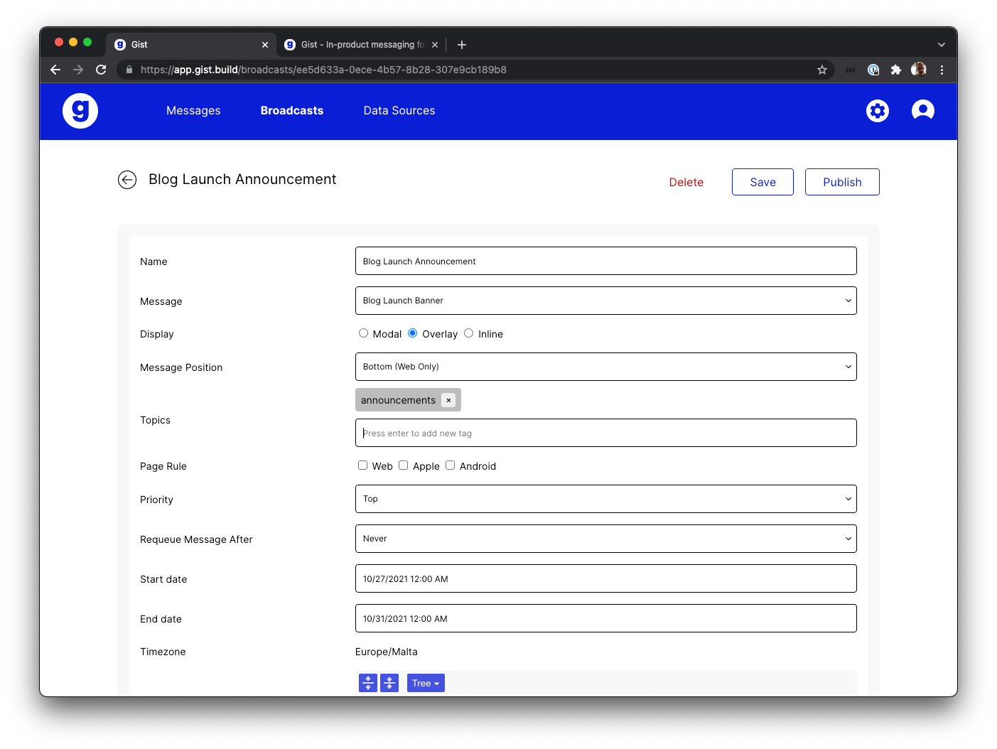 Broadcasts allow you to reach different audiences via Topics. If you followed our Google Tag Manager guide, we've added the topic "Announcements" by default. You can use this topic to send a message to everyone on your website.